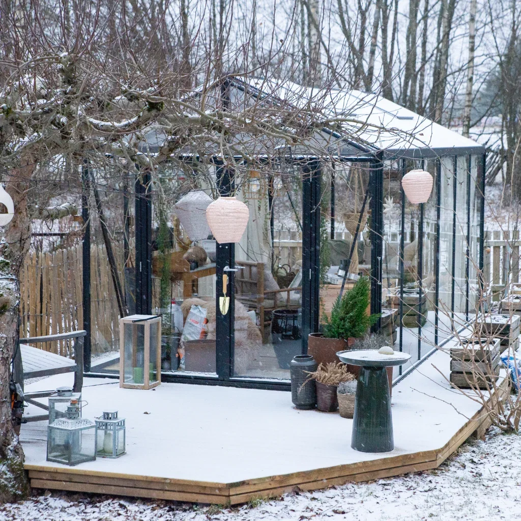 – I don’t want it to be just a storage space. Sheepskins on the furniture, lights, and evergreen plants make it cozy to peek inside. When the winter sun shines, we sometimes enjoy a hot chocolate in there while looking out through the frost-covered windows.