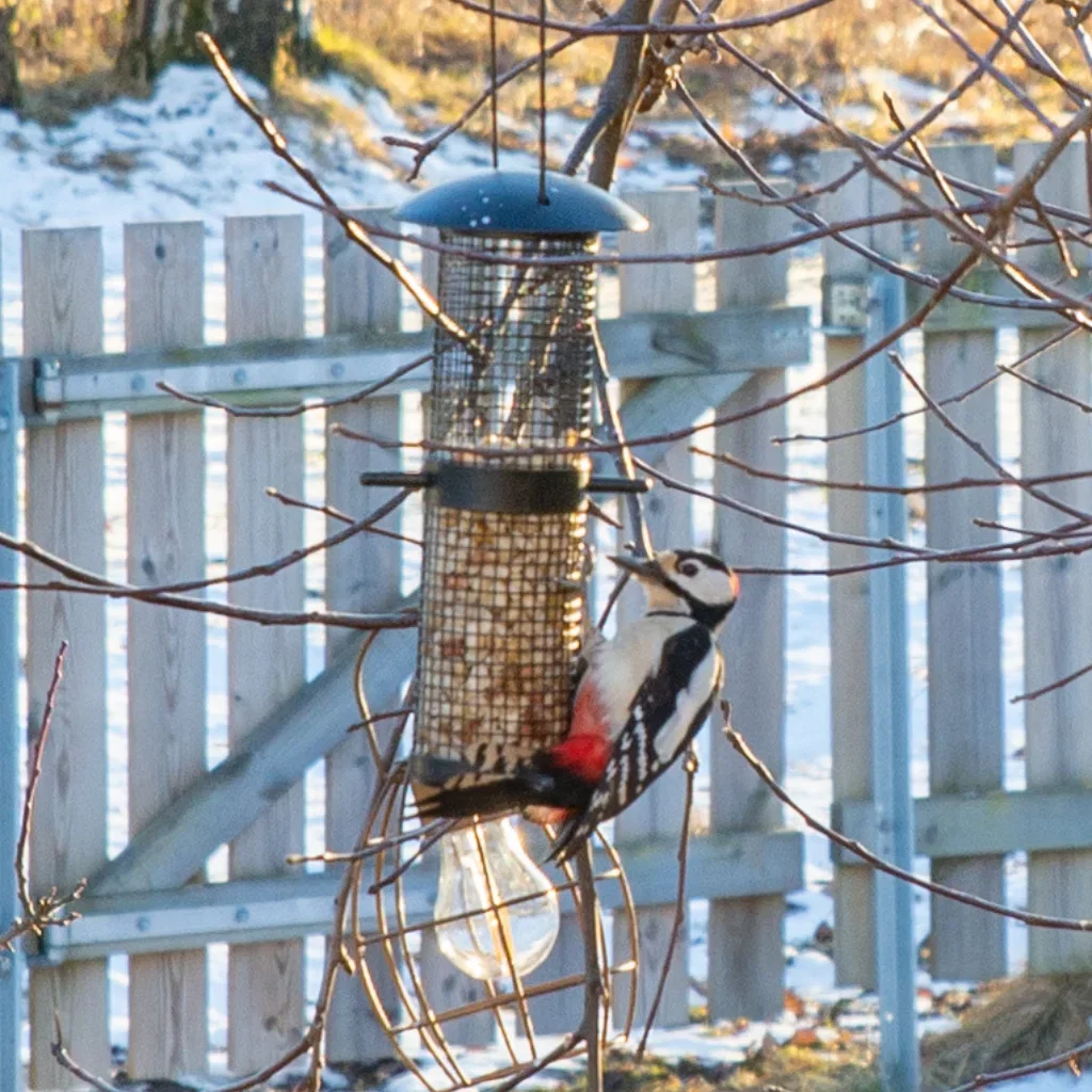 – This attracts a variety of species, like sparrows, tits, finches, bullfinches, and woodpeckers – and they argue less over the food.