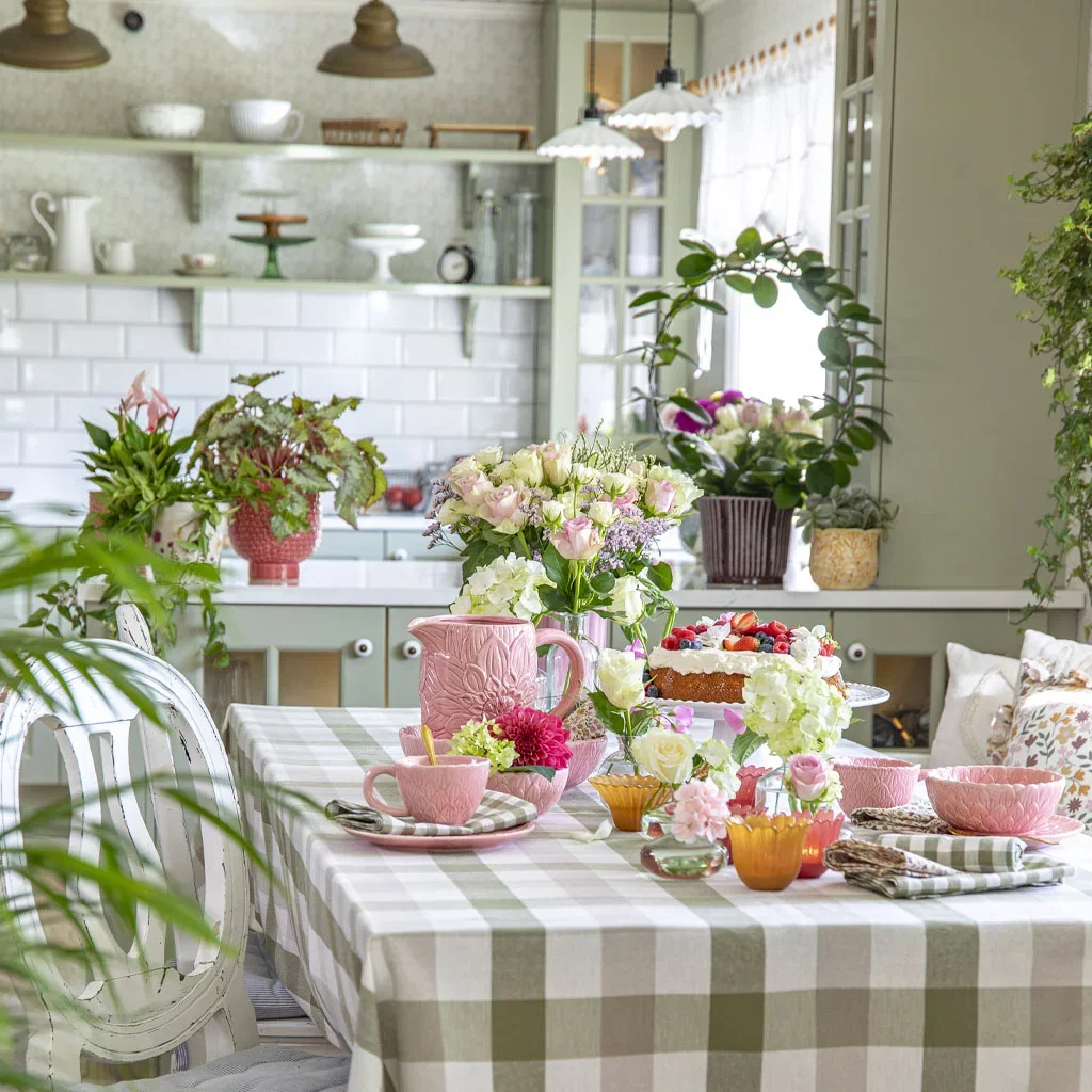 - Sett farge på hverdagen – tør å mikse! Grønne potter, gule puter, en blomstrete duk og kanskje et rosa servise?